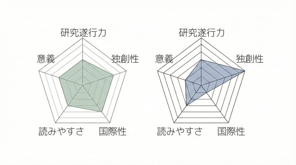 これらは一見、優秀な研究者に見えるかもしれません。しかし、数十通の申請書を連続して読む審査員の目には、「特徴のない平均的な研究者」として映ります。すべてができるということは、裏を返せば「これといった武器がない」ということです。