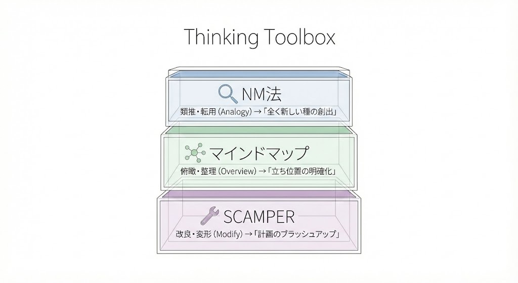 オズボーンのチェックリストは有名ですが、万能ではありません。研究のフェーズや詰まり具合によって、使うべきツールは異なります。本記事では、あなたの脳を「アイデア製造機」に変えるための、3つの異なるアプローチ(NM法、マインドマップ、SCAMPER)を、科研費申請という文脈に最適化して解説します。