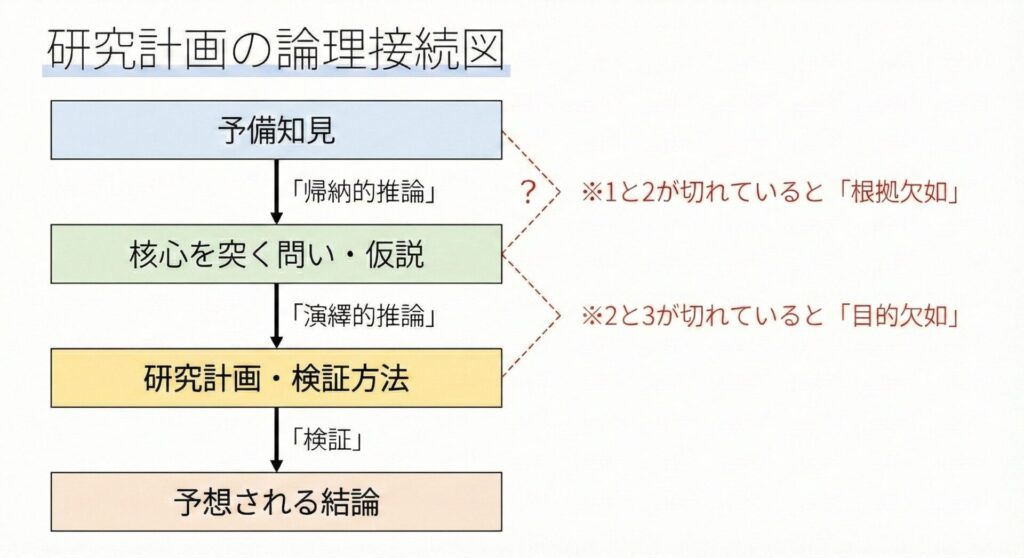 研究計画の審査において、審査員は「この研究は論理的に破綻していないか」を最優先でチェックします。その際、最も頻繁に指摘される瑕疵(かし)が以下の2点です。