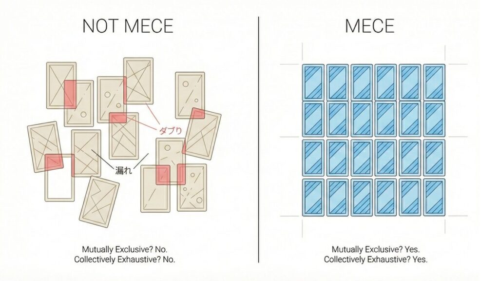 審査員は、申請書の細部を見る前に、まず**「構造の欠陥」を瞬時に見抜きます。この欠陥をなくすための必須概念が、コンサルティング業界などで使われるMECE(Mutually Exclusive and Collectively Exhaustive)です。