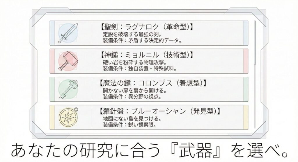 ご自身の研究室にある手持ちのカード(データ、技術、アイデア)を見て、どの「武器」を装備して申請書を書くか選んでください。