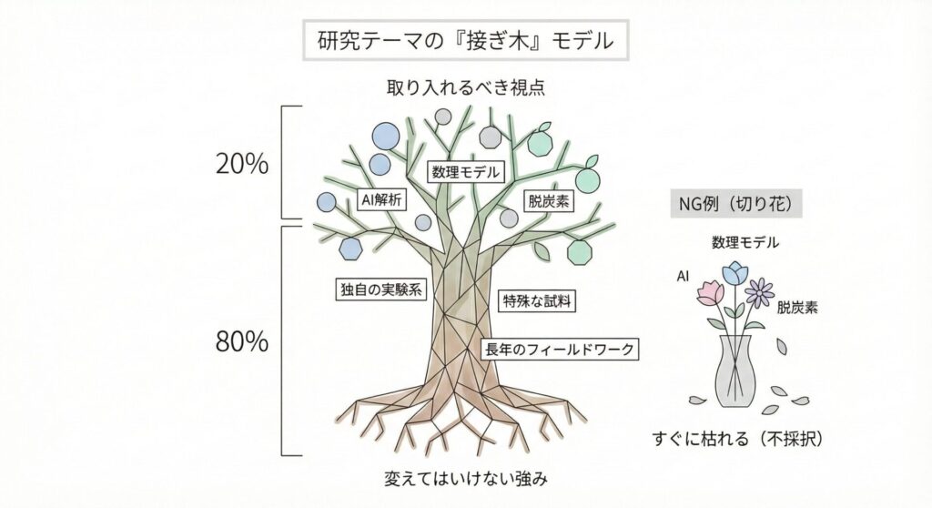 なぜなら、取ってつけたような流行語は、あなたの本来の強み(独自性)を隠してしまいます。専門家が見れば流行語を取り入れてみただけであることは一瞬でバレます。それは「選択と集中」への適応ではなく、研究者としてのアイデンティティの崩壊です。