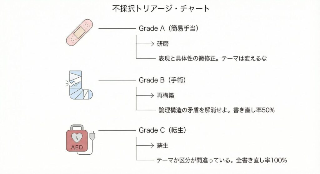 A(上位20%)、B(上位50%)、C(下位50%)。このランクは、あなたの申請書がどの程度の「手術」を必要としているかを客観的に示しています。Aなら「簡易手当」、Bなら「手術」、Cなら「転生」。感情を排してスコアを読み解く、外科医のような修正戦略を解説します。