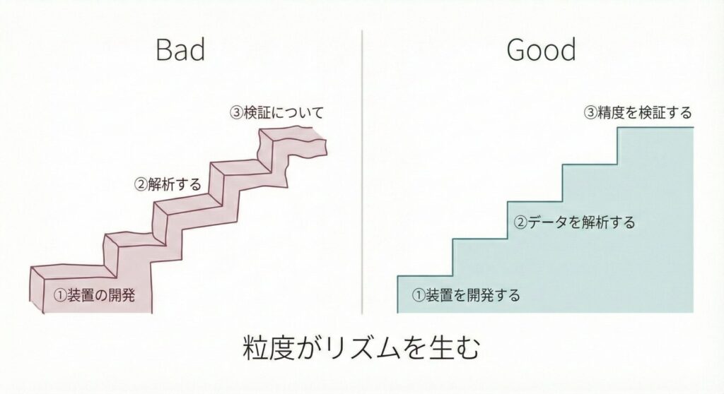 例えば、研究計画の列挙において、「①サンプルの収集」「②分析を行う」「③なぜ結果が異なるのか考察」といった具合に、名詞、動詞、疑問文が混在していたらどうでしょうか。審査員は内容を理解する前に、まずバラバラな形式を脳内で整理し直さなければなりません。この認知的負荷は、そのまま「読みにくい申請書」という評価、ひいては「計画が整理されていない」という印象に直結します。