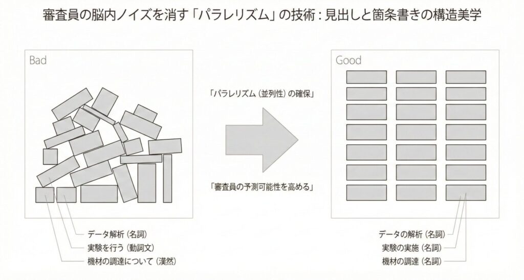 箇条書きや見出しの語尾・粒度が揃っていない申請書は、審査員の脳に不要な負荷をかけます。「体言止めと動詞の混在」や「具体と抽象の不一致」はノイズです。構造の美しさを整えるパラレリズムを意識するだけで、文章の読みやすさと説得力は向上します。