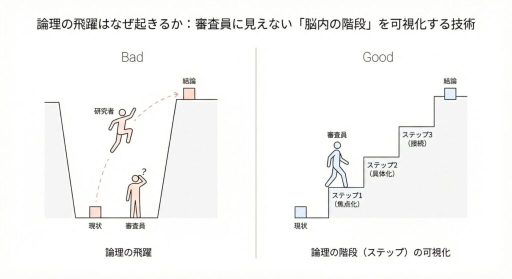 研究者にとって自明な「AならばB」も、専門外の審査員にとっては断崖絶壁に見えることがあります。この論理の飛躍は、あなたの脳内にある暗黙の前提を言語化していないことが原因です。審査員の手を取り、丁寧に段差を埋める「階段」の設計図を解説します。
