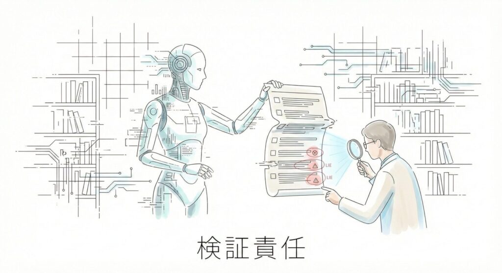 生成AIの「もっともらしい嘘」は研究者の信頼を破壊します。AIは確率で言葉を繋ぐ計算機であり、真実を保証する辞書ではありません。参考文献の捏造や事実誤認を見抜き、正確な裏取りを行う検証技術こそが、AI時代の研究者に求められる核心的スキルです。