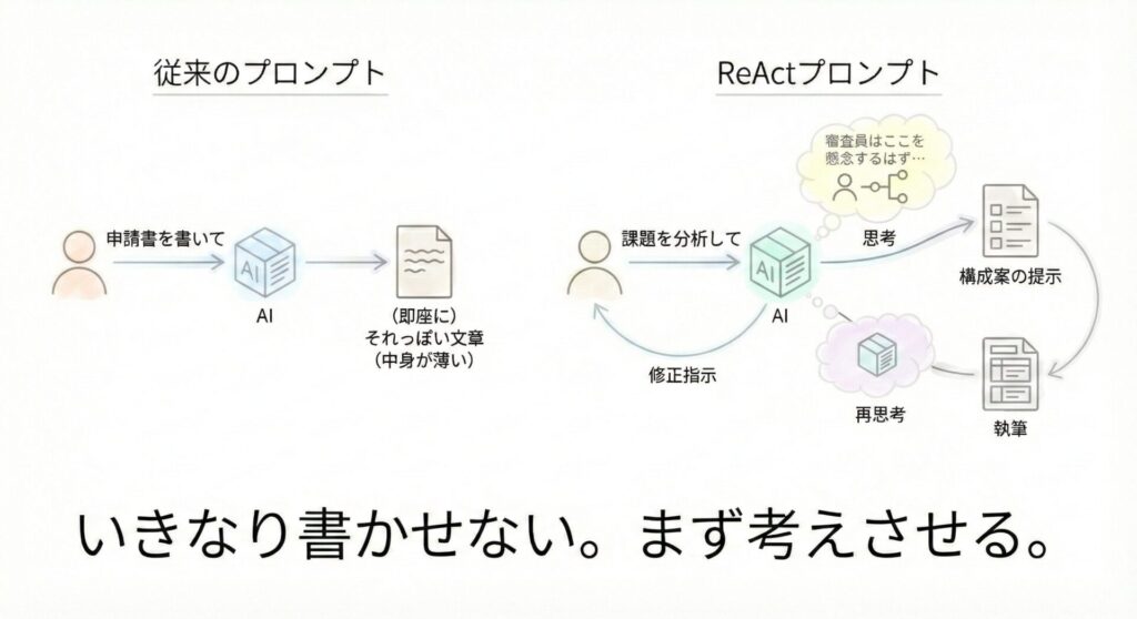 AIに申請書の執筆を頼むと、なぜか内容が浅くなる。その原因は、AIに考えさせずにいきなり書かせているからです。「ReAct手法」を用い、AIにまず論理構成を推論させ、その上で執筆させることで強固なロジックを構築する技術を解説します。