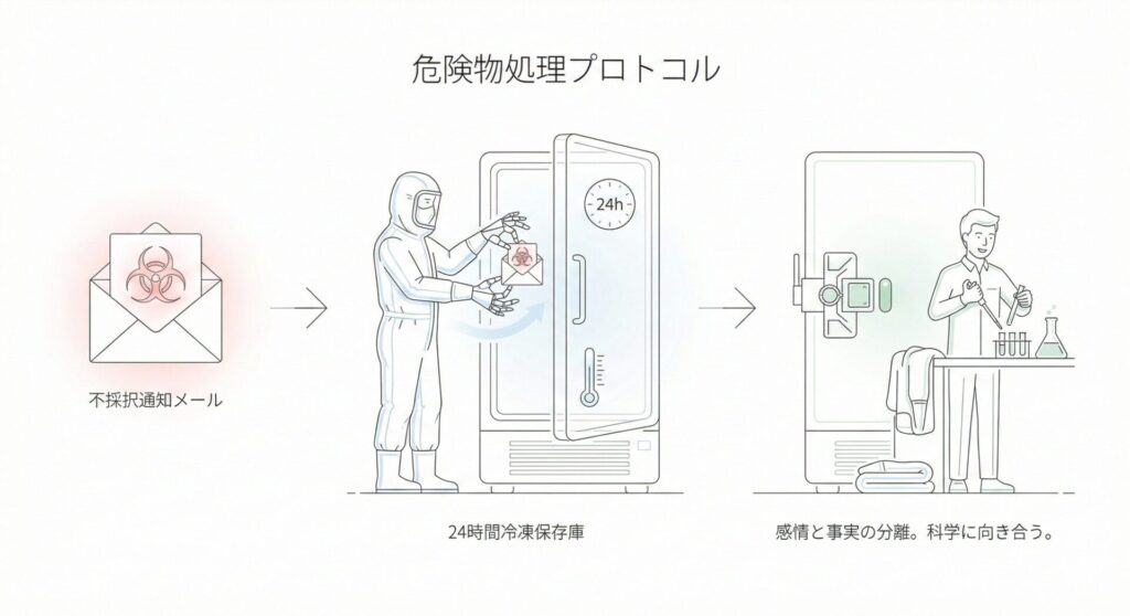 必要なのは、不採択通知を「ただの悲しいお知らせ」として受け取るのではなく、「取り扱い注意の危険物」として処理する厳格なマニュアルです。感情が追いつく前に、事務的かつ機械的に処理を完了させる「即時」供養の儀式を導入しましょう。