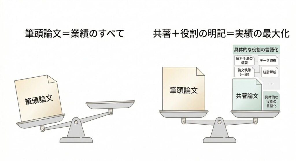 筆頭論文が少なく共著論文がメインであっても自身の貢献を論理的に言語化できれば強力な実績になります。単にリスト化するだけでなく「〇〇解析を担当」と具体的に記述し、研究計画を遂行できる専門スキルを審査員に証明する具体的な記述技術を解説します。