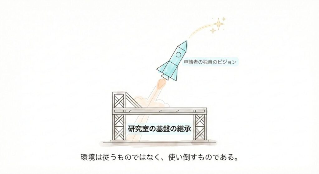 ここで多くの申請者が犯す致命的なミスは、自律性を証明しようとするあまり、指導教員の研究と自身の研究を「完全に切り離してしまう」ことです。「指導教員とは全く違うテーマです」という主張は、裏を返せば「その研究室に所属して行う必然性がない」と判断されかねません。