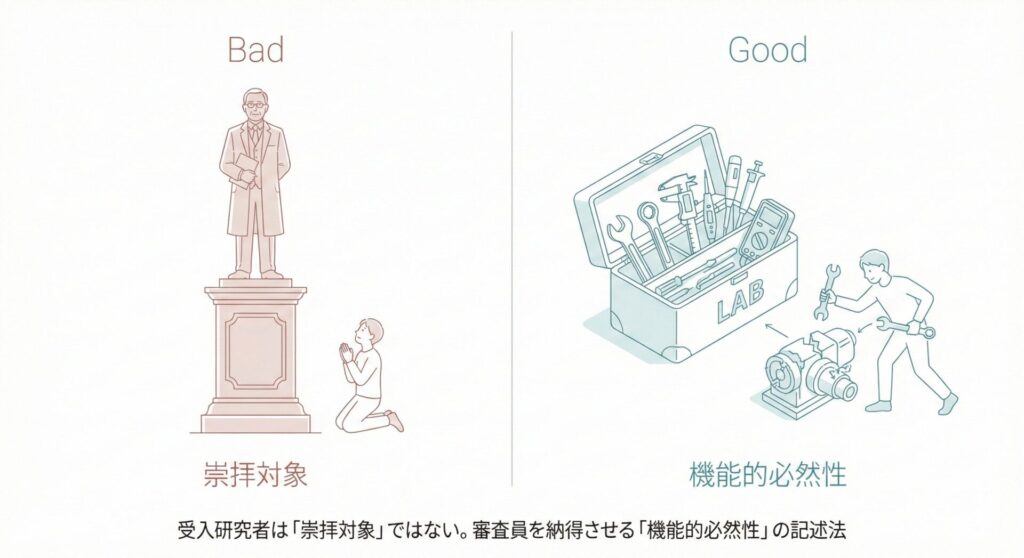 審査員にとってこれらは「既知の事実」か、あるいは「審査に無関係な情報」です。PIが偉大であることと、あなたの研究が成功することは、論理的に直結しません。むしろ、他人の威光に頼ろうとする姿勢は「自身の主体性の欠如」と見なされ、評価を下げる要因にすらなり得ます。
