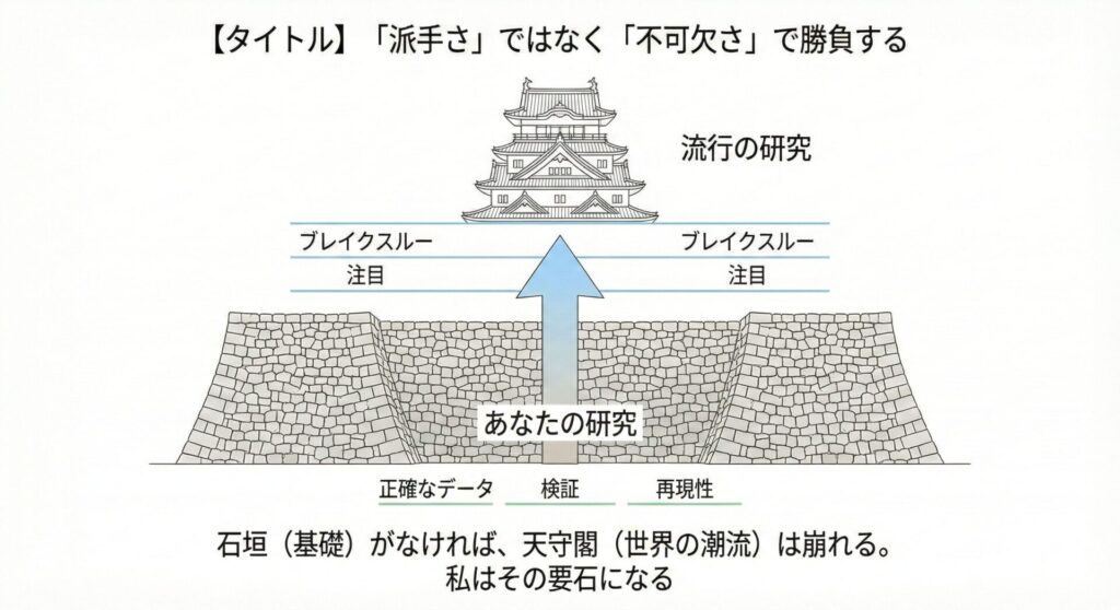 国際性は「派手さ」だけではありません。地味なデータ収集や検証作業こそ、世界の科学が渇望する「インフラ」になり得ます。あなたの研究を「主役」ではなく、世界を支える「公共財」として位置づけ、不可欠さをアピールする記述戦略を解説します。