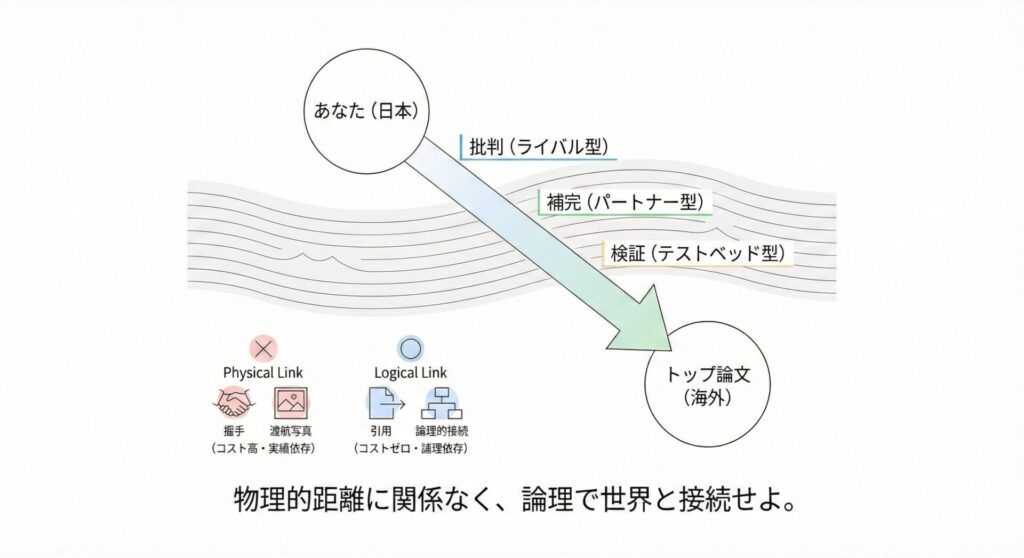 生身の人間関係(コネ)がないなら、文献という公知の事実を使って、論理的に世界との繋がりを構築してしまえばいいのです。実績ゼロの丸腰の状態から、いかにして国際的な文脈を作り出すか、その具体的な記述戦略を解説します。
