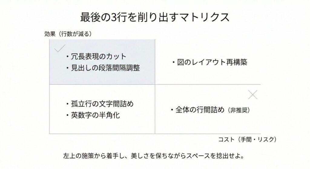 「あと3行が入らない…」前回の4ステップを実践してもはみ出る場合の最終奥義。安易なフォント縮小は読み手の心を折ります。不要な接続詞の削除、能動態への変換、見出し余白の最適化など、美しさと可読性を損なわずに「最後の3行」をねじ込む8つの実践テクニック。