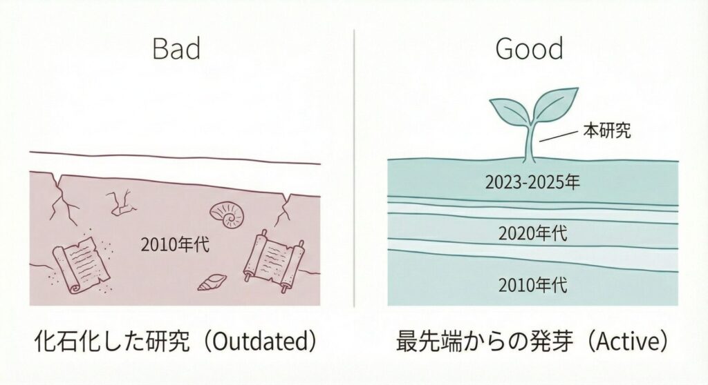 参考文献の鮮度は、情報の正誤以上に、申請者の現役感を証明する最重要パラメータです。