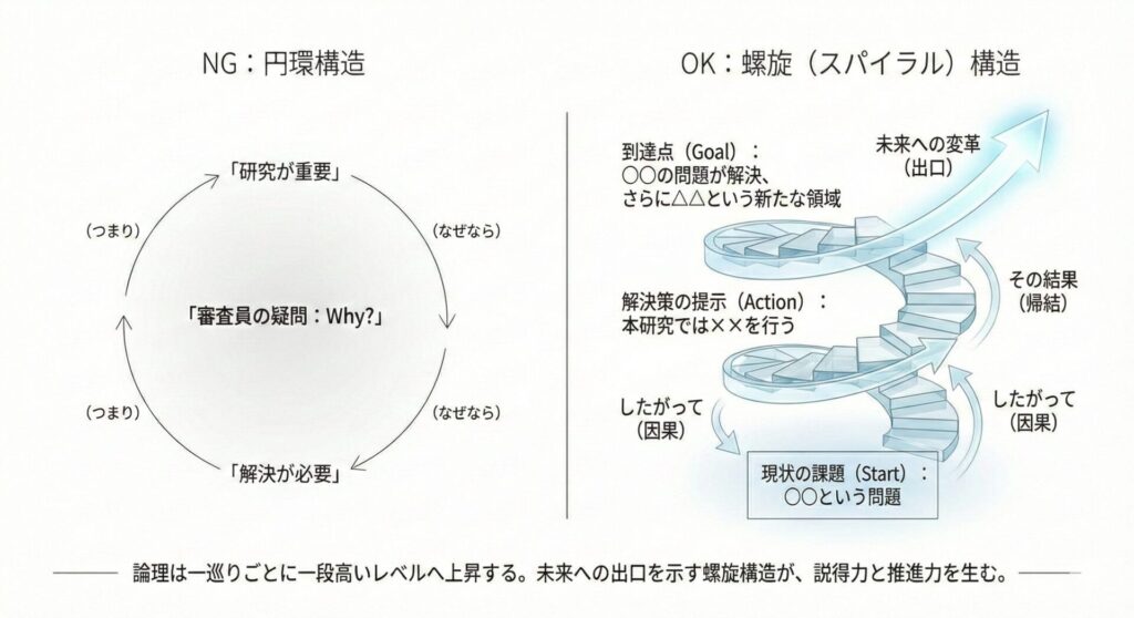 審査員は、あなたの熱意(=重要だと思っていること)を知りたいのではありません。その研究が学術界や社会にとって客観的に価値があるという証拠を求めています。循環論法(トートロジー)は、思考停止の証左と見なされ、採択から大きく遠ざかる致命的なエラーとなります。