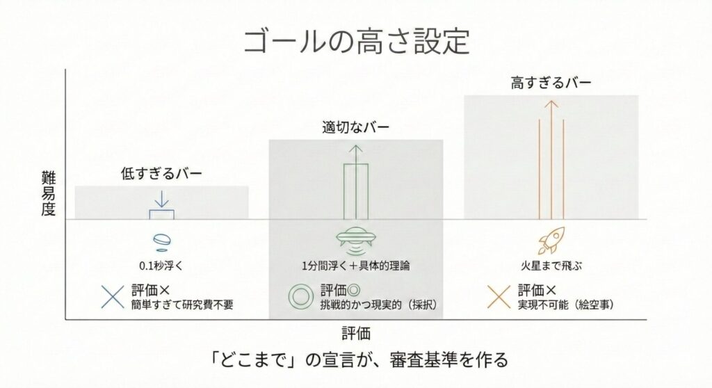 もし、申請者が「0.1秒だけ浮くこと」をゴールにしているなら、「そんなこと研究費を使わなくてもできる(不採択)」と判断されます。