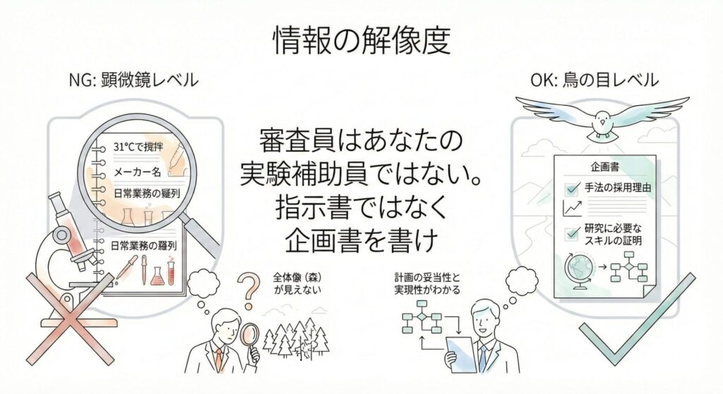 審査員が求めているのは「詳細な操作手順や経歴」ではなく、「その手順を選んだ論理的根拠や研究遂行力があるとする根拠」です。本記事では、つい書いてしまいがちな「無駄な詳しさ」を削ぎ落とし、採択率を高めるための情報の選別技術を解説します。