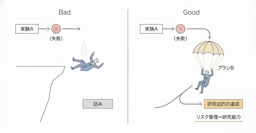 重要なのは、「ここがコケたら研究全体が終わる」という致命的なボトルネックを見極め、そこに対してのみ、強固なセーフティネット(プランB)を張ることです。