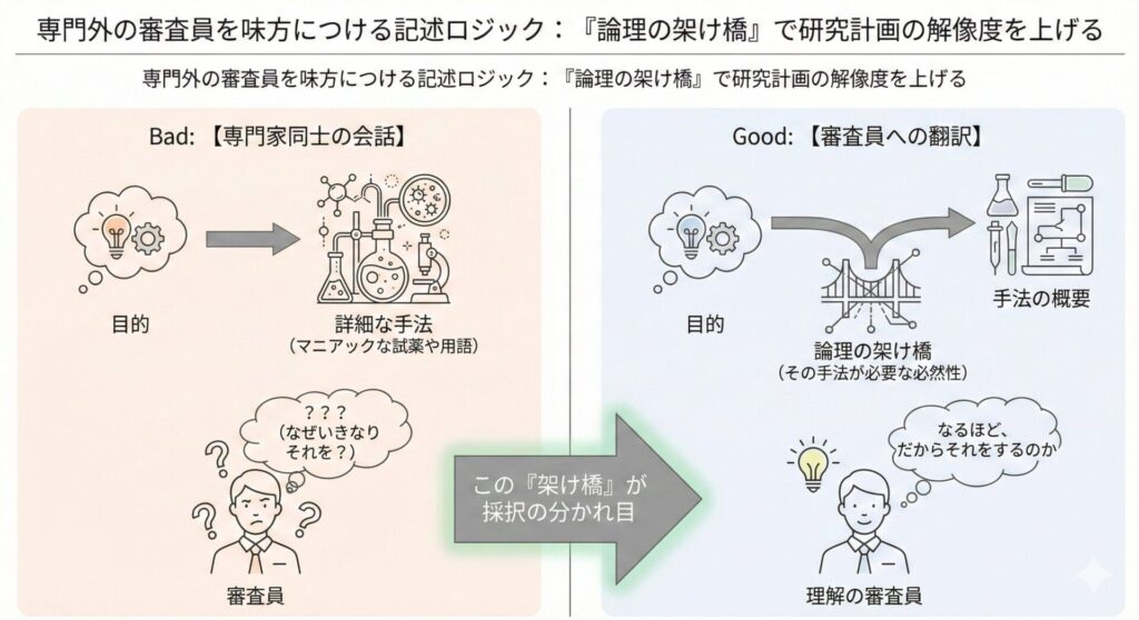 審査員は「あなたの分野の素人」です。いきなり実験手順を語ると彼らは迷子になります。必要なのは「なぜその手法か」を示す論理の架け橋です。目的と手法の間に一行の「ブリッジ」を挟むだけで、申請書の説得力は劇的に向上します。その記述ロジックを解説します。