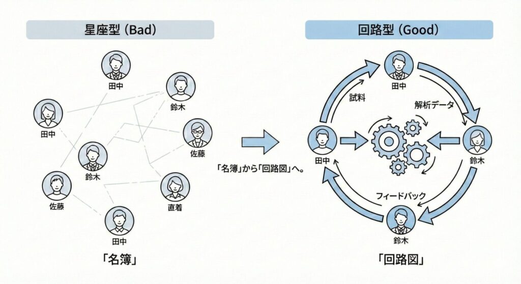 研究体制図は「名簿」ではありません。審査員が見たいのは、名前を線で結んだだけの星座のような図ではなく、誰から誰へ何(試料・データ)が渡り、どう研究が回転するのかを示した「回路図」です。メンバーの必然性と予算の妥当性を一目で証明する、機能的な体制図の描き方を解説します。