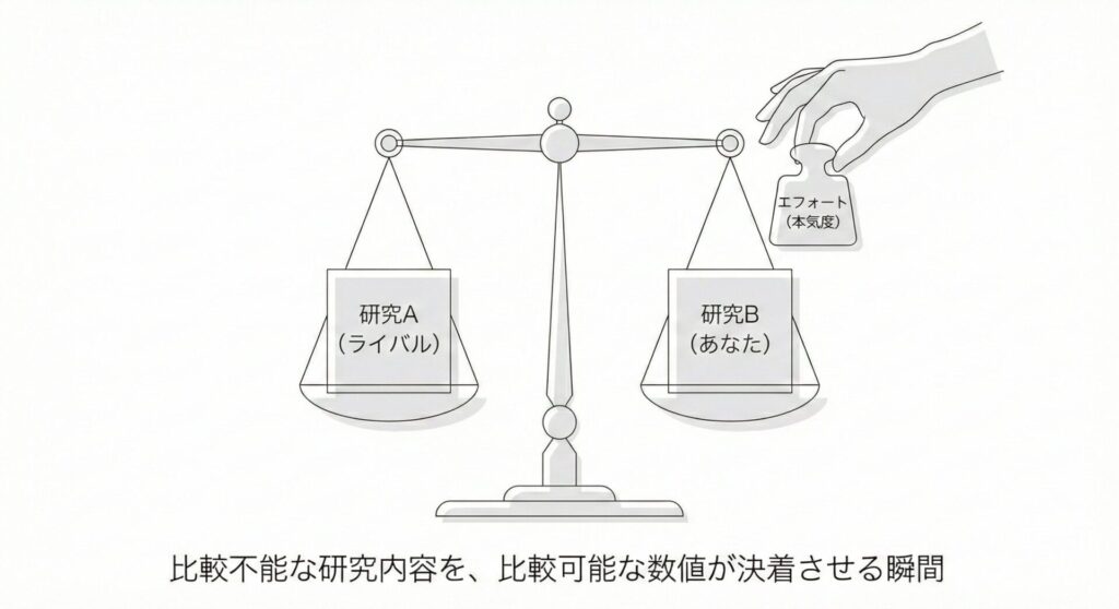 ここでは、エフォートは事務的な数字ではなく、審査員が採否を決定する際の最後の拠り所となり得るのです。