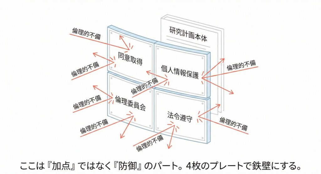 「人権・法令遵守」欄で加点はされませんが、不備があれば即不採択のリスクがあります。ここは時間をかけず、しかし確実に「減点ゼロ」を狙うのが鉄則です。書くべき4つの必須要素と、削るべき蛇足な記述を整理しました。最小限の労力で審査をクリアする、定型的な記述構成を解説します。