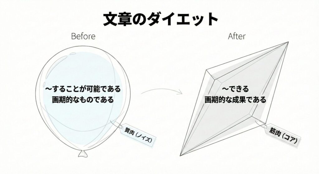 「観察することができる」は「観察できる」へ。「重要なものとなった」の「もの」は「発見」や「転換点」へ。形式名詞の「こと」と抽象名詞の「もの」を削るだけで、あなたの文章は驚くほど筋肉質で力強くなります。贅肉をそぎ落としたアスリートのような文体を目指しましょう。