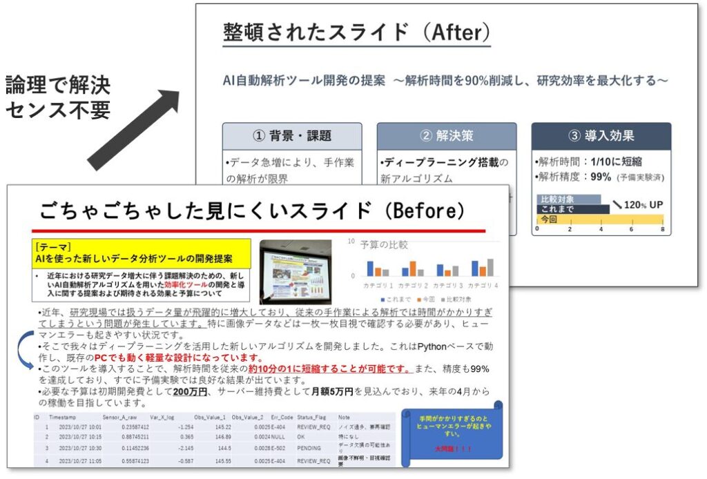 画像の内容案: 「PowerPoint Design 4U」などの作例を参考に、典型的な失敗スライドと修正スライドを並べる。